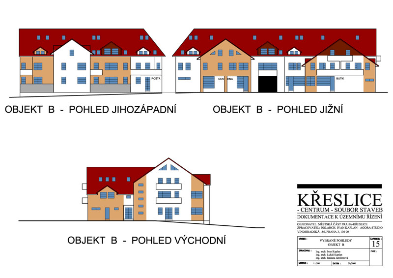 Křeslice se nachází na jihovýchodním okraji Prahy, kam se v současnosti stěhuje mnoho nových obyvatel. Vedení městské části proto zadalo vypracování projektu nového centra ing.arch.Kaplanovi , který jej navrhl z několika bytových budov u nově naprojektované rotační křižovatky, s pokračováním dále do nové rodinné zástavby. Centrum bylo kromě bytů různých velikostí připraveno na umístění malé policejní stanice, školky, pošty, služby první pomoci, sokolovny, městského úřadu, různých služeb, obchodů a restaurace.